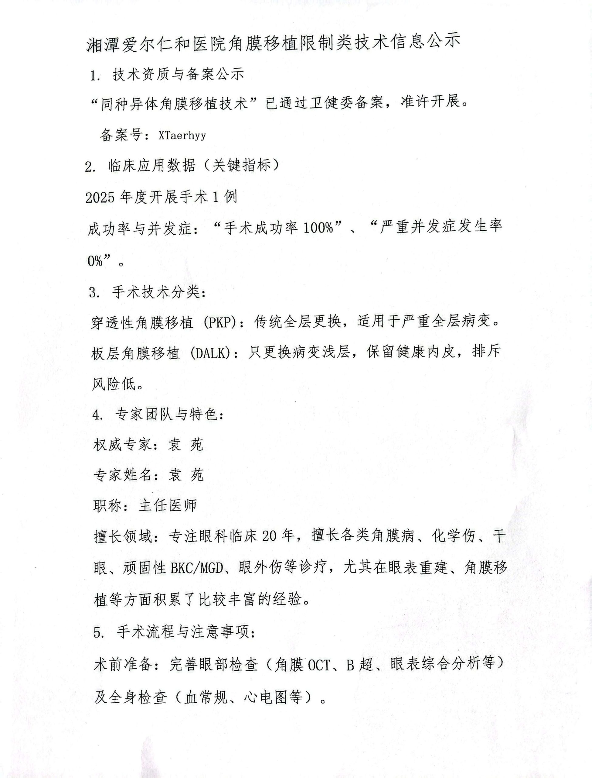 湘潭爱尔仁和医院角膜移植限制类技术信息公示