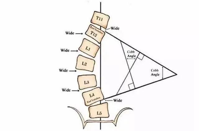 确定侧弯的端椎,上、下端椎是指侧弯中向脊柱侧弯凹侧倾斜度的椎体。在上端椎的椎体上缘划一横线,同样在下端椎椎体的下缘划一横线。对此两横线各做一垂直线,这两条垂直线的交角就是Cobb角。