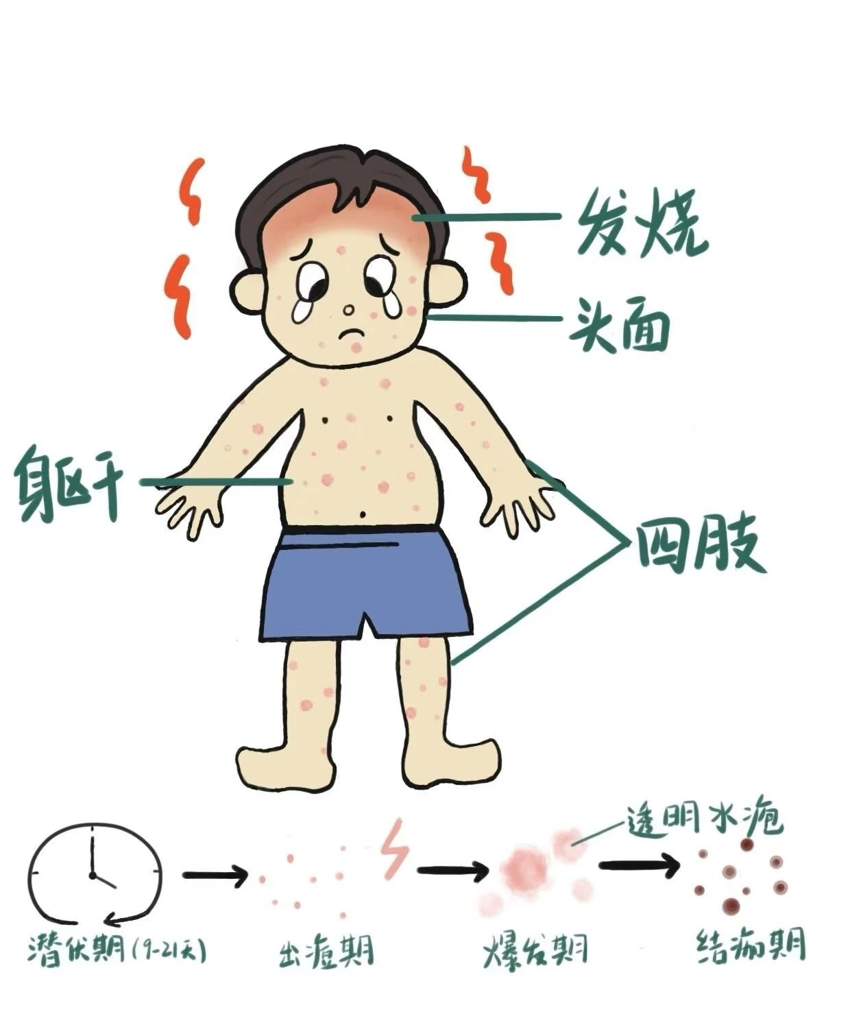 - 症状:发热伴全身性红色斑丘疹→疱疹→结痂(分批出现),瘙痒明显。