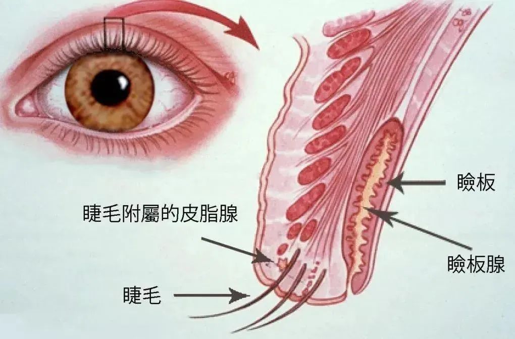 在我们上下眼皮里,有一种特别的腺管,叫做睑板腺。睑板腺能分泌油脂,它分泌的油脂是我们眼睛里泪膜的重要构成。腺管内分泌的油脂会在我们眨眼时排出并铺移到眼睛表面,但长时间疲劳用眼,眨眼次数减少,以及螨虫感染、卸妆不干净等,都会造成睑板腺堵塞,油脂分泌不通畅,从而导致眼睛表面的泪液蒸发过快,眼睛干涩。干眼症患者的睑板腺长期处于病理状态,油脂在常温下呈固态,不易排出。