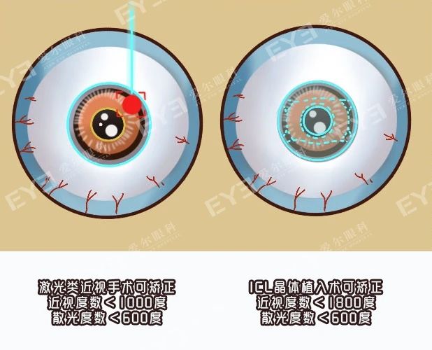 一般来说,激光类近视手术适合近视度数<1000度,散光度数<600度的近视患者。ICL晶体植入术一般来说可以矫正近视度数<1800度,散光度数<600度的近视患者。