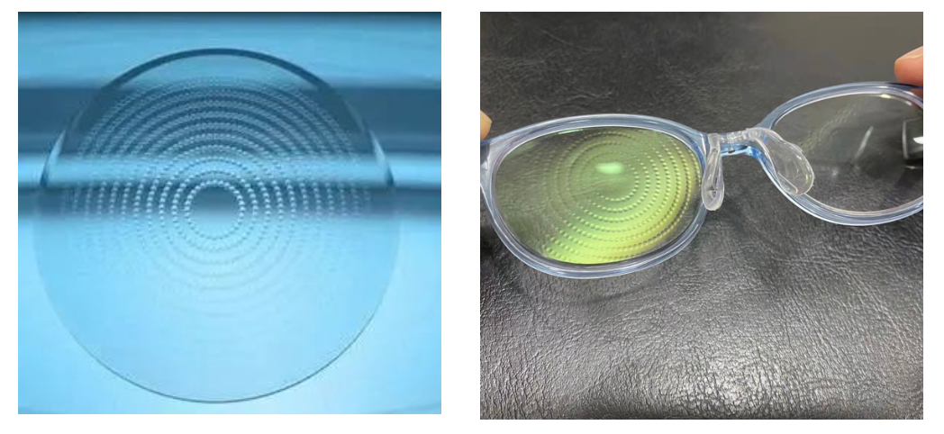 离焦框架眼镜镜片的前表面有着非常多的微小透镜,通过这些微小透镜,在周边视网膜形成“周边近视性离焦”,从而起到近视控制的作用。