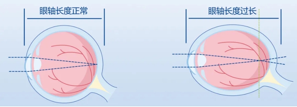 眼轴过长是导致近视的根本原因之一。因此在近视预测中,始终离不开眼轴长度这个词。正常人的眼轴长度出生约18mm,3岁时约22.8mm,成人约24mm。一般情况下,眼轴每增长1mm,近视度数就会增加250~275度。