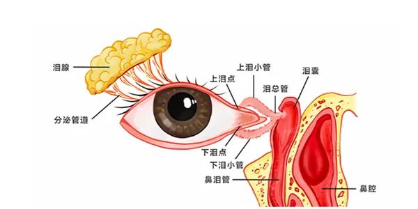泪道连接着眼睛和鼻子,由多个器官组成,包括上下泪小点、上下泪小管、泪总管、泪囊和鼻泪管。