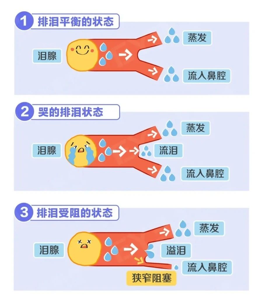 我们的泪液经由泪道排出,正常情况下,泪液一部分被蒸发掉了,一部分通过泪道流入鼻腔内。泪道包括泪小点、泪小管、泪囊和鼻泪管。