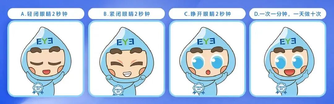 步骤:轻闭眼2秒→紧闭眼2秒→睁眼再两秒。一次做一分钟,一天做10次