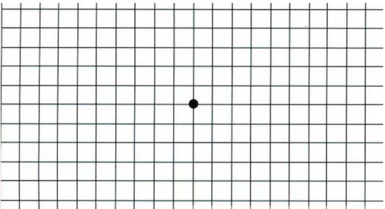 注意:老花眼者在自测的时候,请佩戴老花眼镜。如果你看到表格内线条弯曲、中心点模糊,请速速到医院进行检查。