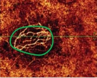 图1:OCT血流成像示视网膜下可见脉络膜新生血管(绿色圈内)