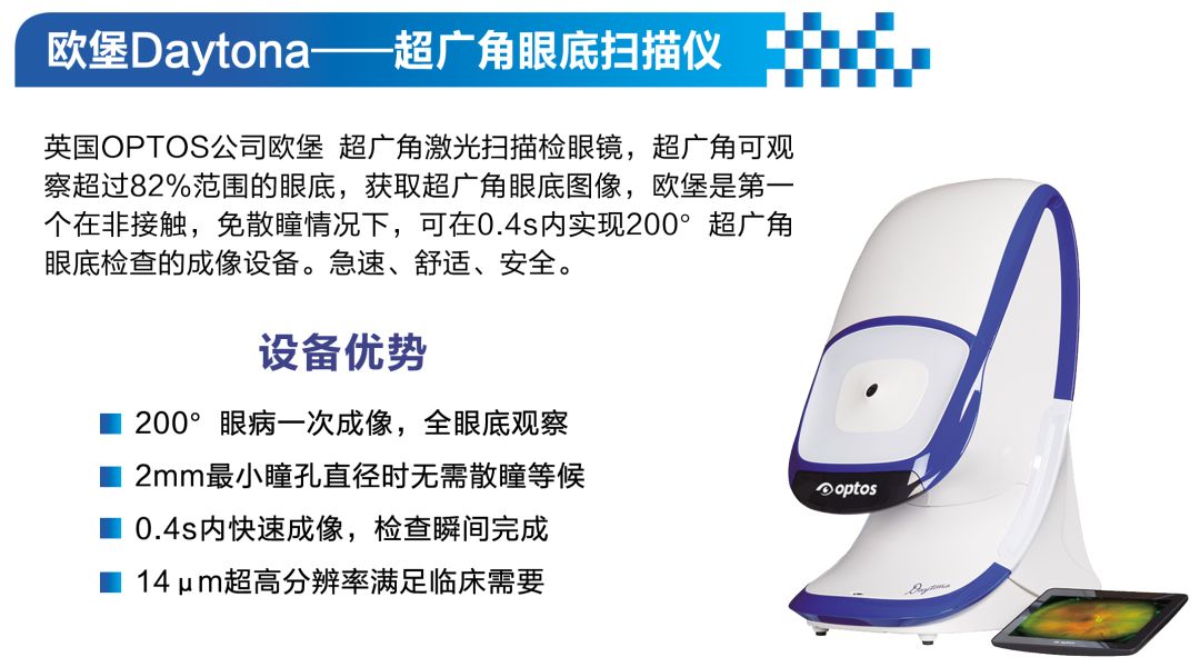 ②超广角:成像范围以200°占据绝对优势,能够覆盖眼底82%的视网膜。加上眼位引导功能,拍照范围可达到220°~240°。发现和诊断视网膜疾病,欧堡更高效。