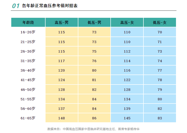 但是人的血压不是一直稳定不变,在一天之内会有所变化,在一生之中也有所变化,而且男性和女性的血压也会有所区别,所以就很需要这张表来做参考。